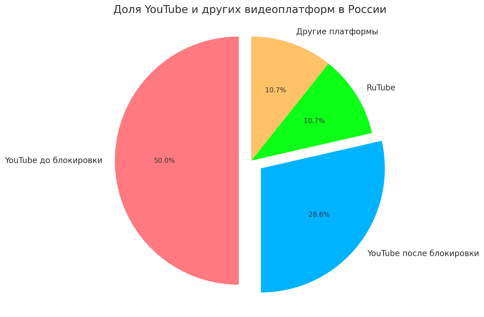 Вот диаграмма о влиянии YouTube в России до замедления его работы и после, а также о других платформах.